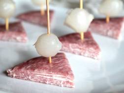 Spread mixture on salami slices and stack five slices high.