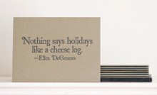Mmm… cheese… Printed on a 100-year-old letterpress, these amusing holiday cards are made with recycled paper and come with coordinating metallic envelopes. Set of 8. Etsy Seller: Cherry Laurel Studio